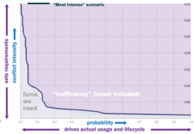 There are a small number of intense scenarios that would require a substantial portion of the fleet, or of key elements of the fleet. The U.S. Navy has traditionally designed the fleet to meet the demands of these scenarios. In its post-Cold War period of dominance, the Navy could build a force able to counter a Taiwan invasion and retain enough residual capability to handle any other situation, albeit much less efficiently than a purpose-built force.