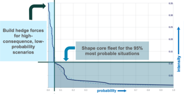 Hedge forces are specialized groups of units designed to address high-consequence, low-probability situations like those on the left side of figure 1. These forces would provide the additional capability and capacity needed for a specific scenario but may not have broad utility in other regions or situations. Figure 2 depicts this force design paradigm using the data of Figure 1.